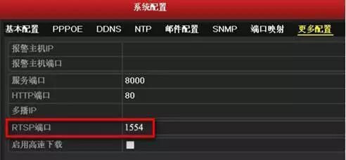 1、进入硬盘录像机主菜单-系统配置-网络配置-更多配置,修改录像机内部端口,将RTSP端口改成1554。